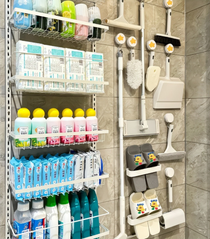 不过,当你养成了这样的收纳习惯之后,堆积的杂物会让卫生间里变得杂乱无章不说,还会产生异味,尤其是各种清洁产品堆积在一起都黏糊糊的,不妨利用墙壁上的空间,在上面放上置物架,把各种清洁物品都固定在上面,收纳变得更轻松,还不会觉得乱。